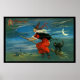 A beautiful vintage Halloween poster featuring a flying witch and a black cat.
