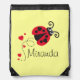 Cute ladybug / ladybird flying with hearts graphic art named kids bag in red, black, white and yellow. Ideal for trips out sleep overs or to take to school. Personalize with your own name, currently reads Miranda. Original graphic ladybug art by Sarah Trett.
