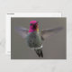 Animal card showing a beautiful colorful hummingbird in flight. Hummingbirds are New World birds that constitute the family Trochilidae. They are among the smallest of birds. They are known as hummingbirds because of the humming sound created by their beating wings which flap at high frequencies audible to humans. They hover in mid-air at rapid wing flapping rates, typically around 50 times per second, but possibly as high as 200 times per second. Hummingbirds have the highest metabolism of any homeothermic animal. To conserve energy when food is scarce, they have the ability to go into a hibernation-like state.