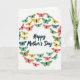 This card features the words “Happy Mother’s Day” centered on a bright white background, written in dark blue lettering with smooth, flowing strokes. Around the message, a ring of small winged insects forms a loose wreath, giving the scene a gentle, affectionate feel, like a circle of caring friends ❤️. The insects are drawn in simple shapes with solid wings in warm coral, sunny yellow, mint green, and deeper jade, paired with thin black bodies and tiny antennae. Some overlap slightly while others angle outward, suggesting soft motion like a quiet flutter in spring air 🌼. The text sits in the open middle with plenty of space around it, making it easy to read while the colorful wreath frames it closely. The background stays plain and uncluttered so the colors stand out without distraction. The wreath looks uneven in an intentional way, with the winged shapes spaced at different distances to create a natural, floating ring. The dark blue greeting sits inside the wreath, while the coral, yellow, mint, and jade wings circle it in a near-round loop.