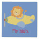 Cute nursery wall art features lion in retro style airplane with "Fly high" text on blue background