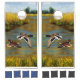 Mallard ducks in flight over a pond reflecting the colors of autumn from nearby foliage.