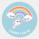 Super cute baby narwhal flying with happy rainbow clouds. Personalize with your own text.