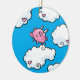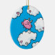 A hanging ornament featuring a digital cartoon pink pig with little white wings, dances on clouds embellished with hearts up in the bright blue sky.