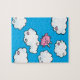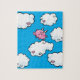A puzzle featuring a digital cartoon pink pig with little white wings, dances on clouds embellished with hearts up in the bright blue sky.