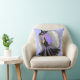 Purple witch flying on a full moon. The illustration features a witch with purple hair and heels. The design also features a grey silver full moon and stars. Cute witchy pillow for Halloween home decor. Add this design to your witchy Halloween decorations. Great pillow design to give to sisters, friends, or girlfriends during the month of October.