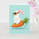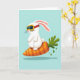This card features a chubby white bunny with pink-lined ears and a tiny red nose, gazing forward with a confident, friendly look 🐰. Yellow-framed goggles with dark lenses sit snugly on its face, held by a red strap that adds a dash of daring charm. The bunny rides through the air on a giant orange root vegetable, its surface marked with darker stripes that give it depth and motion. A leafy green top trails behind, spraying bright green droplets like a little rocket stream, as if the bunny is racing to meet a close friend. The background is a soft light blue that keeps the focus on the pair and makes the scene feel open and airy 🌷. A short Easter greeting appears near the top in a warm, easy-to-read color, with a smaller line of text placed below it in a coordinating shade. Beneath them, an elongated shadow stretches lightly across the blue, showing the bunny and its carrot-like ride hovering above the ground.