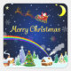 Beautiful snowscapes with Christmas trees, houses, a snow man, and a rainbow over the snow falling from the sky. Santa Claus flying over the Crescent moon on Christmas night.