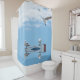 Funky Flying Sitting Seagulls Birds Blue Sky Shower Curtain to add to your home / office / business decor collection. A cool gift / present idea for all who love industrial feel, custom design items.