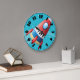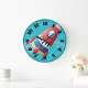 Dreaming of flying through space in a spaceship. Well then this design will answer that dream. It is off a colorful spaceship that is zipping through space. The rocket is is multicolored and has a vapour trail out the back. It is set against a blue background. This flying spaceship design looks great on this clock. Perfect for yourself or as a gift