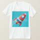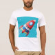 Dreaming of flying through space in a spaceship. Well then this design will answer that dream. It is off a colorful spaceship that is zipping through space. The rocket is is multicolored and has a vapour trail out the back. It is set against a blue background. This flying spaceship design looks great on this mens t-shirt. Perfect for yourself or as a gift