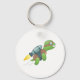 Adventurous turtle with a rocket jetpack and aviator goggles is flying with a happy grin.