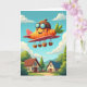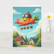 This design shows an elongated orange vegetable-shaped flying craft with a wide grin, rosy cheeks, aviator goggles, and a snug pilot cap, drifting through a bright blue sky 🌷. Beneath its coral-toned wings, several small round baskets hang on short lines, as if carrying little surprises meant for someone special. Soft, puffy clouds are spaced across the upper background, giving the scene plenty of open air and a calm pace. Below, two cozy cottages sit among leafy green trees and trimmed lawns, one with a warm terracotta roof and the other with a deep slate-blue roof, like friendly neighbors leaning toward each other. A winding dirt path curves between the homes and leads toward pale mountains on the horizon, adding a gentle sense of journey. The lighting is soft and even, and the warm oranges and fresh greens balance the cool blues to create a tender, companionable mood 🐰. A short Easter greeting appears near the top in light-colored lettering that stands out against the sky, with a smaller line of text placed beneath it in a matching tone. The baskets under the wings are shaded in warm browns with tiny highlights along their rims.
