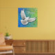 Original fine art design of a flying white peace dove against a pretty blue green background by artist Carolyn McFann of Two Purring Cats Studio printed on a quality poster print.