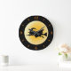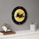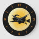 Large Round Wall Art Clock and home furnishing decor accessory with Flying Wicked Witch Black Silhouette around the golden yellow harvest moon glowing light artwork design illustration By TheFabricSeal is a scary looking sorceress with her flying witch broom and her pointed conical shaped witch hat as she quickly streaks through the dark of night sky and passing in front of the full yellow Halloween moon.