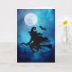Flying witch silhouette with a black bat . Full moon shines bright in a beautiful blue shaded starry night sky . Inside the card - Creepy bat flying in beautiful blue shaded starry night sky . Personalize with your own message or delete text if you wish to leave it blank ( for handwritten message)