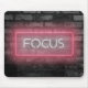 Focus text in pink neon sign glowing on black brick wall with rustic texture