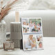 Chic photo collage plaque features six square photos (2 large, 4 small) arranged in a grid layout with a fog grey stripe running through the center. Personalize with your custom caption, family name, and/or year. Ideal for displaying your photography portfolio or treasured family photos.