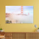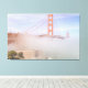 The iconic Golden Gate Bridge in San Francisco is partially obscured by a thick layer of fog. The bridge's red towers and suspension cables are visible against a backdrop of a pale blue sky. The fog creates a sense of mystery and ethereal beauty, enveloping the bridge and the surrounding landscape. A smaller section of the bridge is visible in the distance, also shrouded in fog.