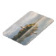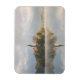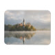 Rectangular souvenir photo magnet of a foggy sunrise at Bled Lake with the island with church and mist with reflection in the water in the first sunlight of the morning in Slovenia.