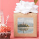 Souvenir photo sticker of a foggy sunrise at Bled Lake with the island with church and mist with reflection in the water in the first sunlight of the morning in Slovenia.