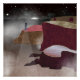 A beautiful landscape with unique textures showing a cliff side lighthouse and foggy night time ocean with a rising moon and starry sky in shades of red, pink, gold, silver, and blue.