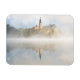 Rectangular photo magnet with a foggy sunrise at Lake Bled with reflection of the island with the church in the still water of the lake and with Bled Castle in the background on a beautiful autumn day in Slovenia.