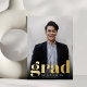 Modern graduation announcement features a single vertical/portrait oriented photo, with "grad" along the bottom in gold foil lettering. The graduation year is tucked into the design, with the graduate's name and school along the bottom. Add a personal announcement to the back, along with an additional photo.