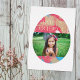 This festive holiday photo card features a large Easter egg design with a bold marble texture background. The "Happy Easter" greeting, as well as the name and date, are pressed in gold or silver foil for added elegance, and to contrast the colorful background. There is ample space for a customer photo within the egg design. The back of the card features a simple stripe pattern with the same marble texture.