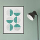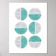 This modern art print features a series of circles divided in half, and divided up with curvilinear and straight lines. The solid half of each circle is a vibrant teal color, while the other half is pressed in gold or silver foil. This design is versatile enough to work with a variety of decor styles, but I think it would look great in an office or loft.