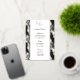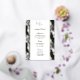This wedding menu card is shown in an elegant white and gold foil tropical palms print, script and standard text in a black color.