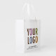 Personalize this foldable grocery bag with your company logo and custom text. It's white polyester fabric that is lightweight but can hold up to 50 lbs and foldable into a pouch with a snap closure. It's printed in full-color with option to print on both sides. Reusable custom logo grocery bags can advertise your business as company swag while being green for the environment. Dimensions are 16 inch (H) x 12 inch ( L) x 5 inch (W). No minimum order quantity and no setup fee.