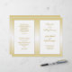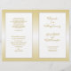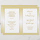 Folded, catholic wedding program template with gold gradient background, printed on linen paper. This layered-look program contains four pages to customize. Solid white panels hold the gold color text which has a modern appearance of combined handwritten script and printed fonts. Each page has space for lots of text to accommodate an involved ceremony. The last page (back of program when folded) includes a section for scripture (sample is "Love is patient, love is kind" from 1 Corinthians) and a message from the bride and groom. Programs have paper options, and must be folded after purchase.