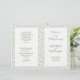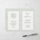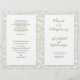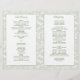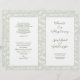 Folded, catholic wedding program template with patterned background. This layered-look program contains a background design of white leaves and little flowers, over light, sage green. Solid white panels hold the text which is green, with a modern appearance of combined handwritten script and printed fonts. Each page has space for lots of text, on four "pages", to accommodate an involved ceremony. The last page (back of program when folded) includes a section for scripture (sample is "Love is patient, love is kind" from 1 Corinthians) and a message from the bride and groom. Programs have paper options, and must be folded after purchase.
