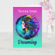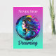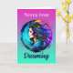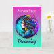 Pretty woman with blue, turquoise, blue, yellow and red colorful ai art done in a mystical ethereal surreal vibe. Inspirational quote, "Never Stop Dreaming."