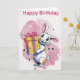 A charming watercolor and ink illustration of a bunny standing upright holding a brightly colored wrapped present with a bow. The background is a whimsical pink with confetti like shapes to encode a festive mood. The present is colorful with a vibrant bow that pops against the watercolor hues. Perfect for a children’s birthday card, this design exudes warmth, playfulness and celebration.
