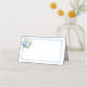 This folded name place card is shown in basic white with a lovely floral bouquet of hydrangeas and daisies and a classic dusty blue color border frame.