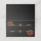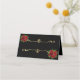 This folded name place card is shown in a basic black color background with a lovely festive red roses and holly print.