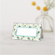 This folded name place card is shown in basic white on the matte card paper with a lovely peacock feather print in colors of teal and gold.