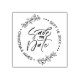 One of a kind design rubber stamp features a brush script "save the date" in the middle with modern typography and foliage to make a circular shape.