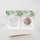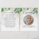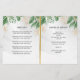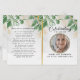 Customize this modern, elegant funeral program with your own photo and text to create a special tribute to your Beloved. An 'In Loving Memory' program featuring a foliage of eucalyptus with gold accent leaves. memorial program. On the front cover is a photo of your loved one, their name, dates, the memorial venue, and the date of the event. On the inside is an obituary and order of service, and on the back is a thank you note and the venue of the