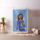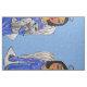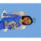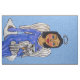 This custom fabric by the yard has a pretty folk art angel with bright blue eyes wearing a blue dress with white stars sitting on a white cloud holding her white and gray angel cat. Both have silver halos on sky blue background.