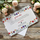 This Folk Art Floral Botanical Fiesta Spanish Wedding Thank You Card design features an intricate floral border in vibrant hues of red, pink, orange, and blue, creating a cheerful and lively frame for the invitation. The flowers are arranged with swirling vines and leaf motifs, giving the composition a harmonious flow and adding a sense of movement to the design. Small decorative details, such as dots and teardrop shapes, enhance the festive and folkloric feel, making this layout perfect for a joyful wedding celebration with a Mexican-inspired theme.
