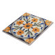 "symmetrical folk art symmetry", "orange yellow dark blue", "navy white golden daisy", "hand painted italian flower", "traditional classic authentic ceramic", "botanical painted tile painting", "floral decorative round circle", "rustic circular mexican talavera" "vintage spanish portuguese mediterranean", "country flowers leaf pattern"