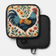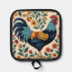 A blue rooster with gold wings and a bright red comb is surrounded by colorful flowers on this charming folk art style pot holder. Perfect for anyone who loves folk art, country, and chickens.