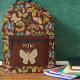 This patterned backpack has illustrations of moths in a modern folk art style with a spot to personalize the bag with initials or a name in light green lettering.. The print features moths in shades of pink, blue, green, yellow and tan against a warm and earthy brown background.