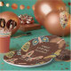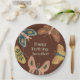 These custom party supplies are perfect for birthday parties and other special occasions. The paper plates are ready to be personalized with your own message and feature pretty folk art style illustrations of moths in warm, earthy colors of pink, yellow, green, blue and light brown set against a rich brown background.