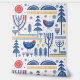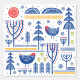 This folk art design features a woodland winter scene with birds, snowflakes and trees.