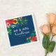 Blue cocktail napkins for a wedding with colorful floral arrangements in yellow, red, pink, teal , and green. Mr & Mrs in modern white fonts. Your last name in a pretty white script. Add your wedding date too!