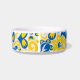 This is a heavy, durable bowl decorated with Tibbies of many colors, the perfect size for hungry/thirsty Tibs. The design is interesting and printing clear.